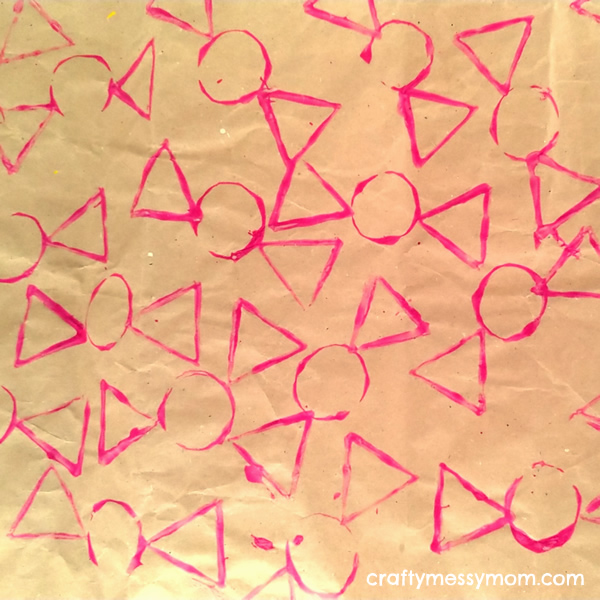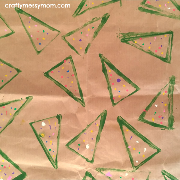 This year we created our very own stamps simply using cardboard scraps shaped into triangles, toilet rolls and paint, and we used them to print shapes onto recycled packing paper.